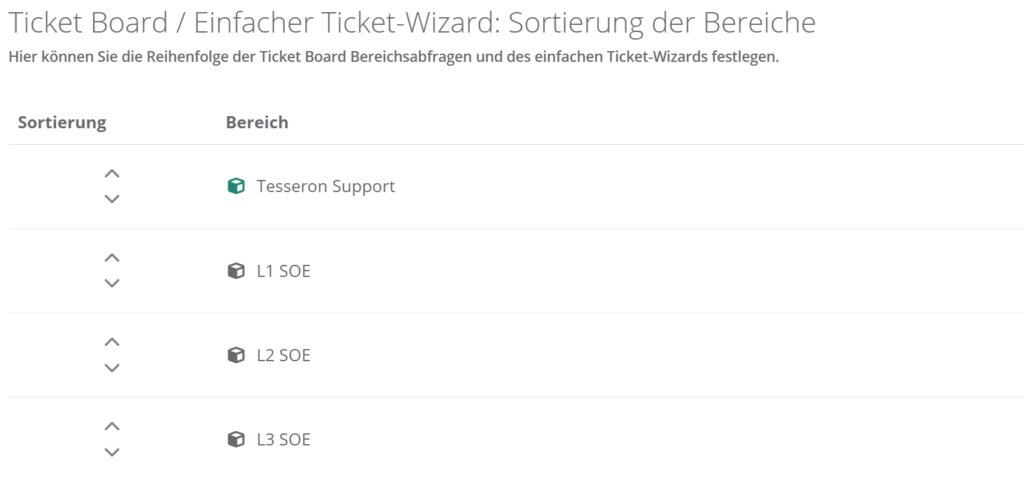 Die Sortierreihenfolge der Bereiche können Sie über Drag-and-Drop festlegen. Diese bestimmt, in welcher Reihenfolge die Bereiche und Bereichsabfragen im Ticket Board sowie im einfachen Ticket-Wizard dargestellt werden.