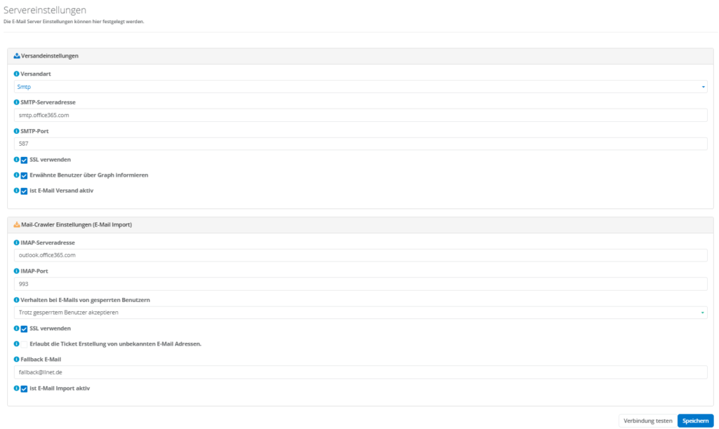 Verfügen Sie über ein Office365 Konto können Sie die folgenden Standardwerte für den E-Mail-Versand eingeben: