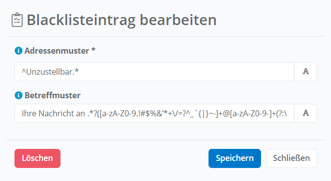 Geben Sie im nächsten Schritt das Adress- bzw. Betreffmuster als reguläre Regex Expression an. Alternativ können Sie die jeweilige E-Mail-Adresse oder den Betreff einfügen. Klicken Sie anschließend