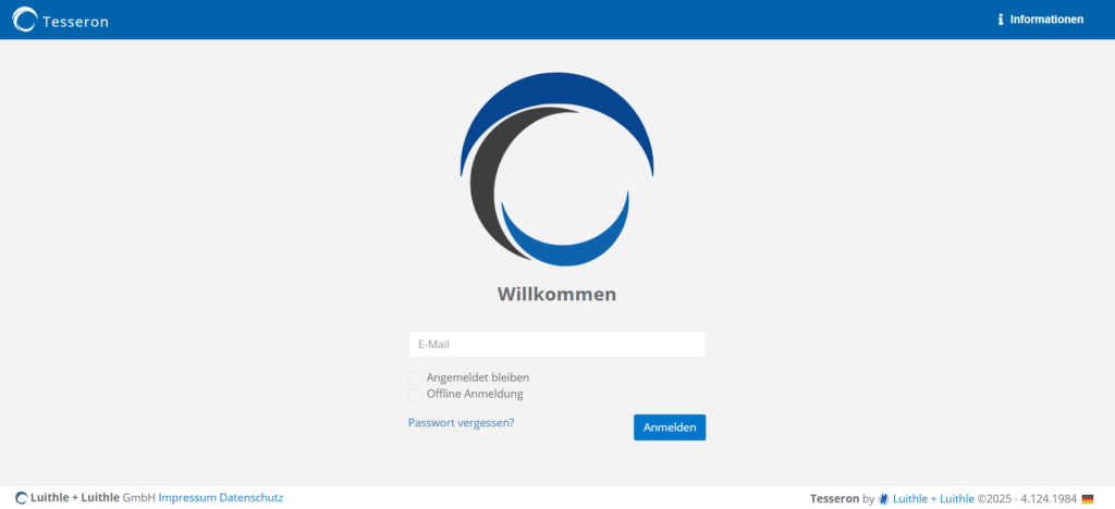 Sie werden nun zu der Tesseron Startseite weitergeleitet. Geben Sie hier Ihre E-Mail-Adresse sowie Ihr Passwort (aus unserer E-Mail) ein.