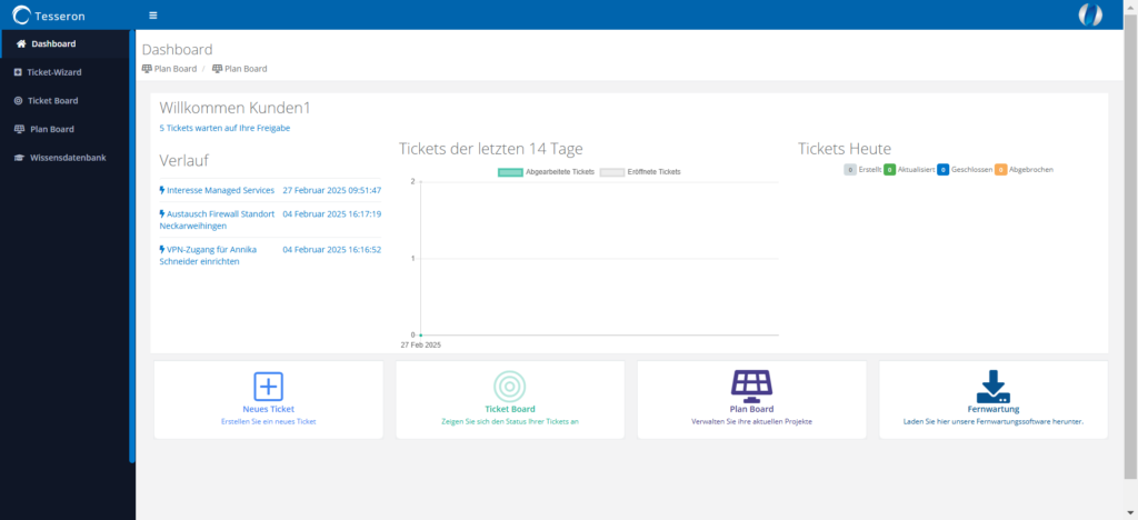 Nach der Anmeldung landen Sie als erstes auf dem Dashboard. Unter Ihrer Begrüßung wird angezeigt, wie viele Tickets auf Ihre Freigabe warten. Mit einem Klick gelangen Sie zu den freizugebenden Tickets.