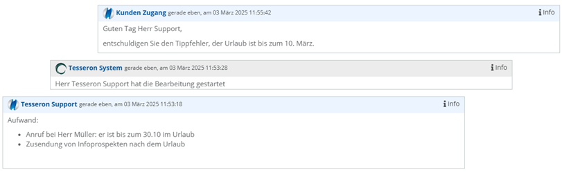 Im unteren Bereich eines Tickets finden Sie die Ticketpositionen, welche den Bearbeitungsverlauf dokumentieren. Über das Eingabefeld darüber haben Sie die Möglichkeit, eigene Positionen zu verfassen. Bestätigen Sie mit Senden, um Ihre Position zu verschicken.