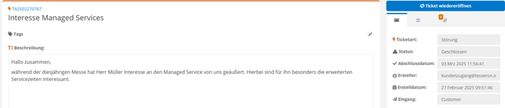 Falls Ihnen zu einem bereits abgeschlossenen Ticket neue Informationen einfallen bzw. eine Weiterbearbeitung nötig ist, können Sie das