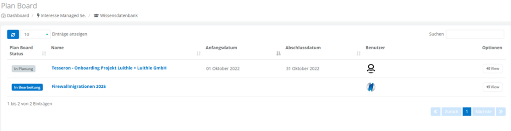 Unter Plan Board finden Sie eine Übersicht über alle Plan Boards, zu denen Ihr Benutzer hinzugefügt wurde. Klicken Sie auf den Namen eines Plan Boards oder den