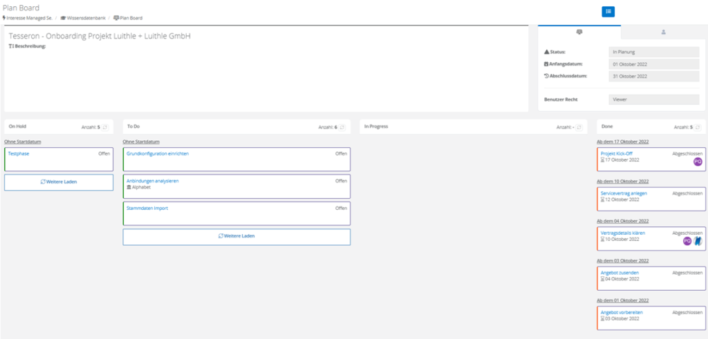 Im oberen Bereich finden Sie den Titel sowie die Beschreibung des Plan Boards. Direkt darunter finden Sie die einzelnen Plan Board Tätigkeiten. Mit einem Klick auf eine der Tätigkeit finden Sie weitere Details zum jeweiligen Punkt.