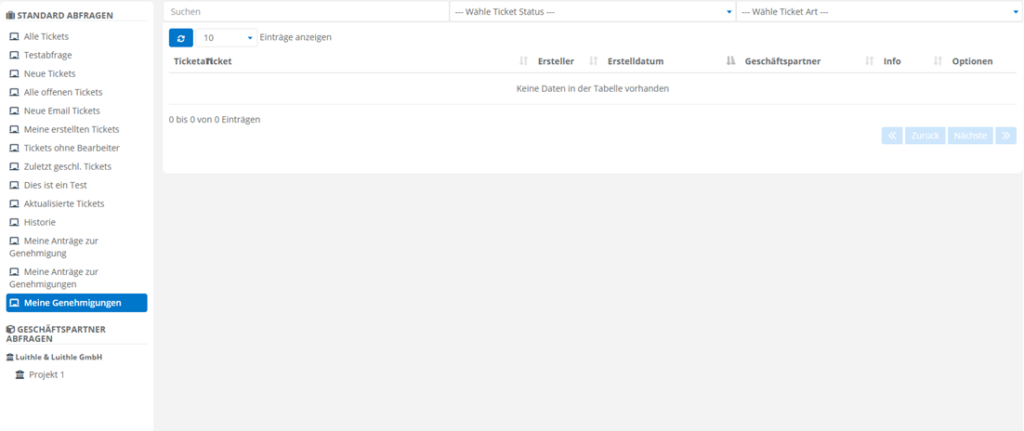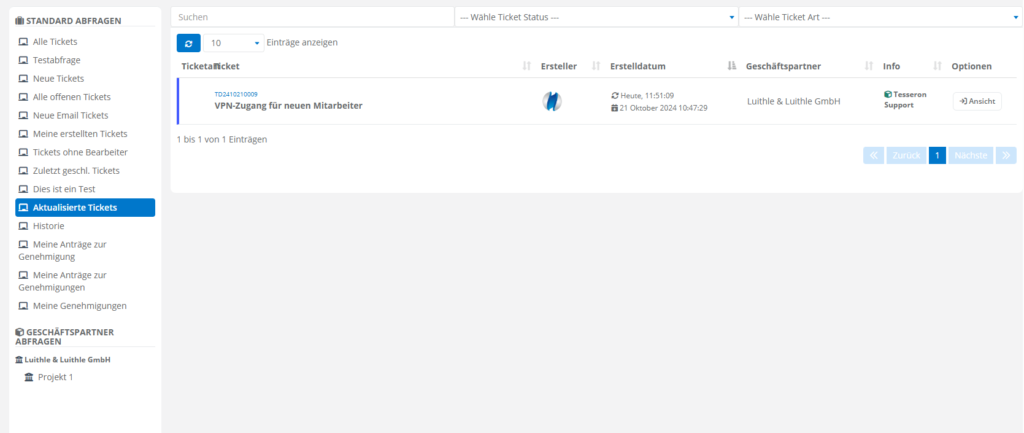 Um die Tickets in der ausgewählten Abfrage zu durchsuchen können Sie die Suchfunktion nutzen oder Filter anhand des Ticket Status und der Ticket Art konfigurieren (es werden Ihnen alle Ticketarten des Systempartners angezeigt):