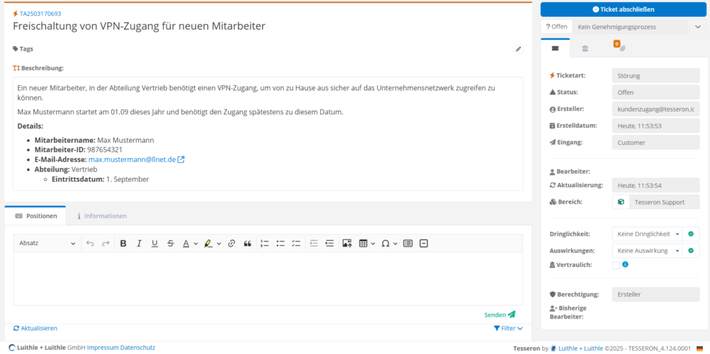 Zusätzlich können Sie die Dringlichkeit und Auswirkungen des Tickets anpassen, um eine Priorisierung für die Bearbeiter zu erleichtern.