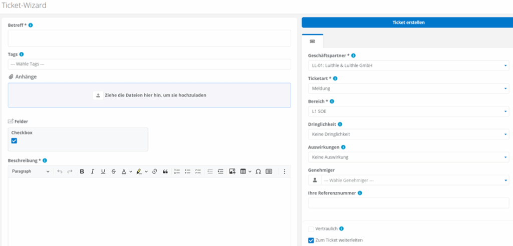 Daraufhin kann auf der rechten Seite der Geschäftspartner des Tickets gewählt werden. Wählen Sie daraufhin die Ticketart. Abhängig von der gewählten Ticketart können Ihnen zusätzliche Felder angezeigt werden. Geben Sie dann den Bereich an, in dem das Ticket erstellt werden soll.