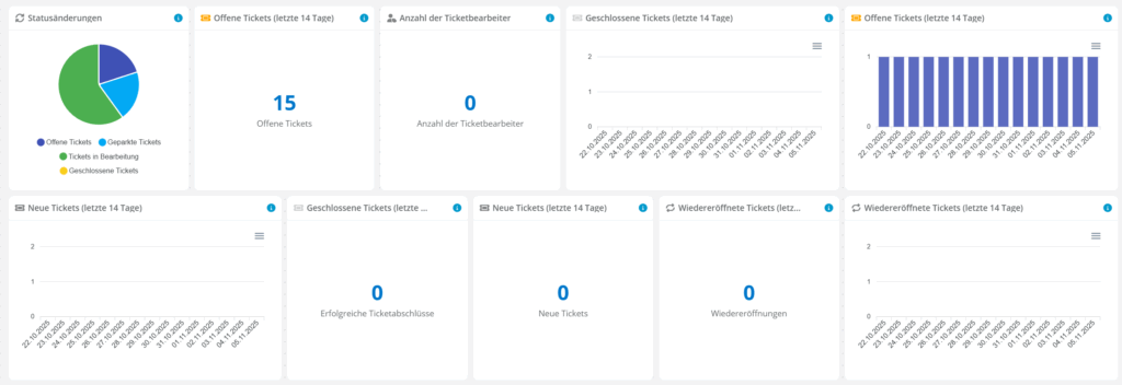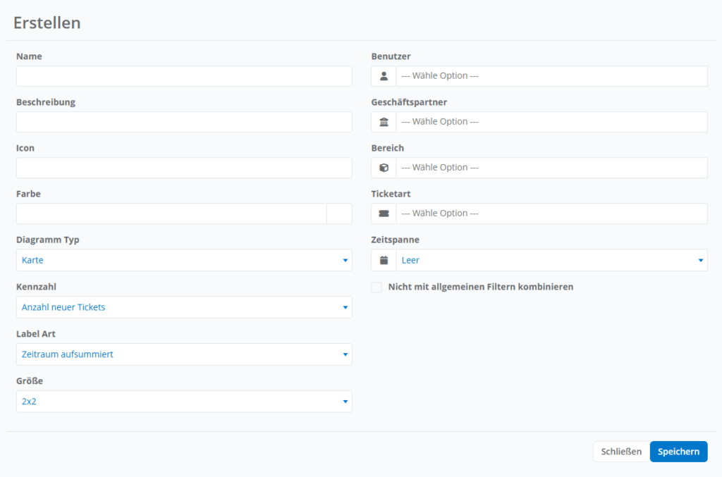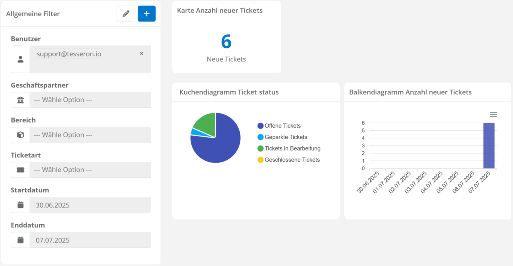 können Sie allgemeine Filter konfigurieren. Dort können Sie Benutzer, Geschäftspartner, Bereiche und/oder Ticketarten wählen. Über das Start- und Enddatum können Sie den Zeitraum einschränken. Mit einem Klick auf