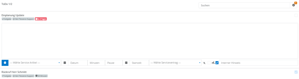 In gespeicherten ToDos können Sie zusätzlich offene Abrechnungshinweise erstellen. Nutzen Sie den Haken auf der rechten Seite, um ein ToDo abzuschließen.