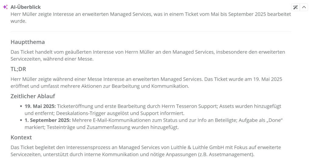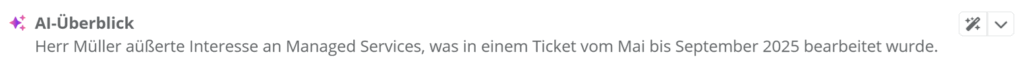 Um eine Zusammenfassung des Ticket-Verlaufs zu generieren, Klicken Sie . Daraufhin wird der Ticket Betreff sowie die Beschreibung und alle Positionen an die konfigurierte KI geschickt, damit die hauptsächlichen Inhalte des Tickets zusammengefasst werden. Daraufhin steht Ihnen nach der Generation ein kurzer Überblick zur Verfügung.