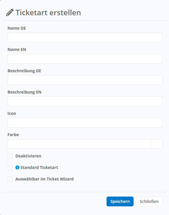 kann eine neue Ticketart erstellt werden. Hierfür muss der deutsche sowie englische Name, die entsprechenden Beschreibungen, das Icon (FontAwesome) und die Icon-Farbe angegeben werden.