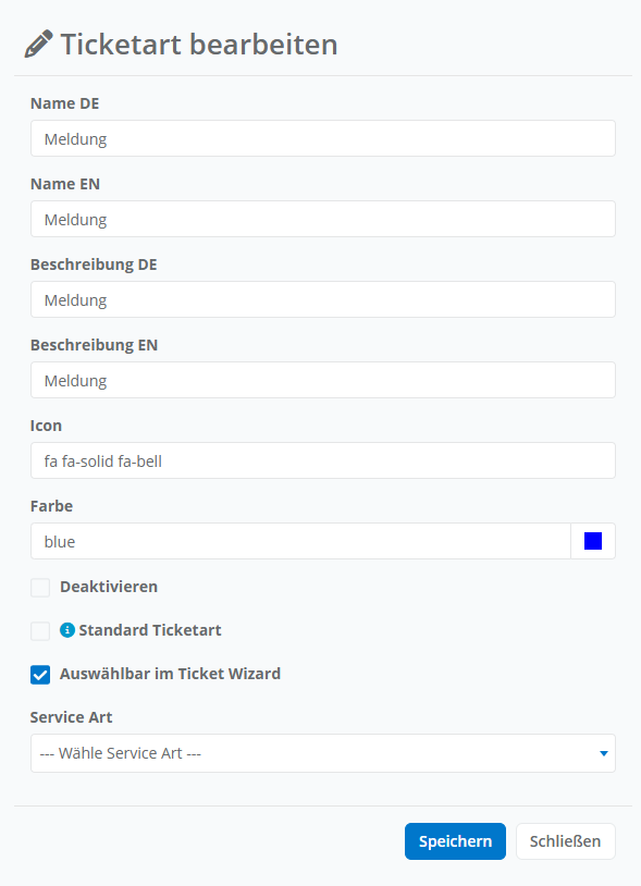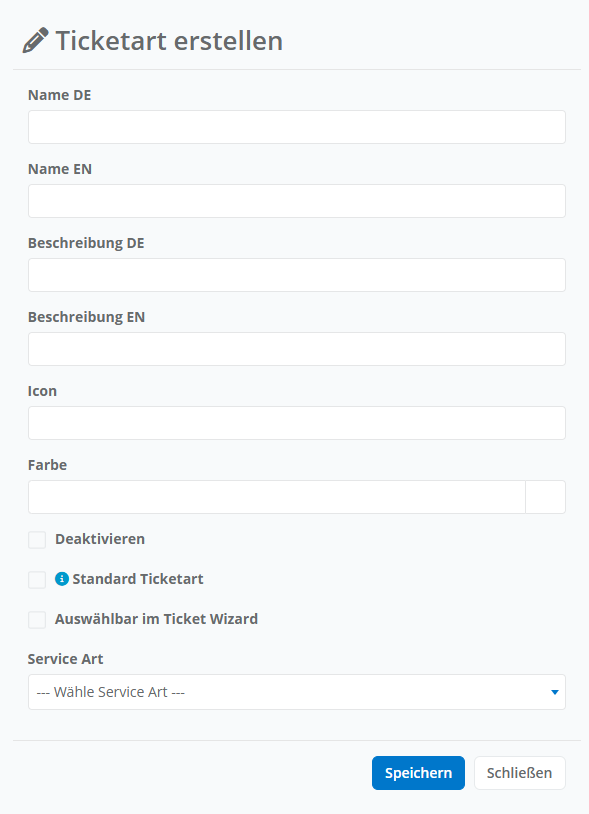 Über kann eine neue Ticketart erstellt werden. Hierfür muss der deutsche sowie englische Name, die entsprechenden Beschreibungen, das Icon (FontAwesome) und die Icon-Farbe angegeben werden.
