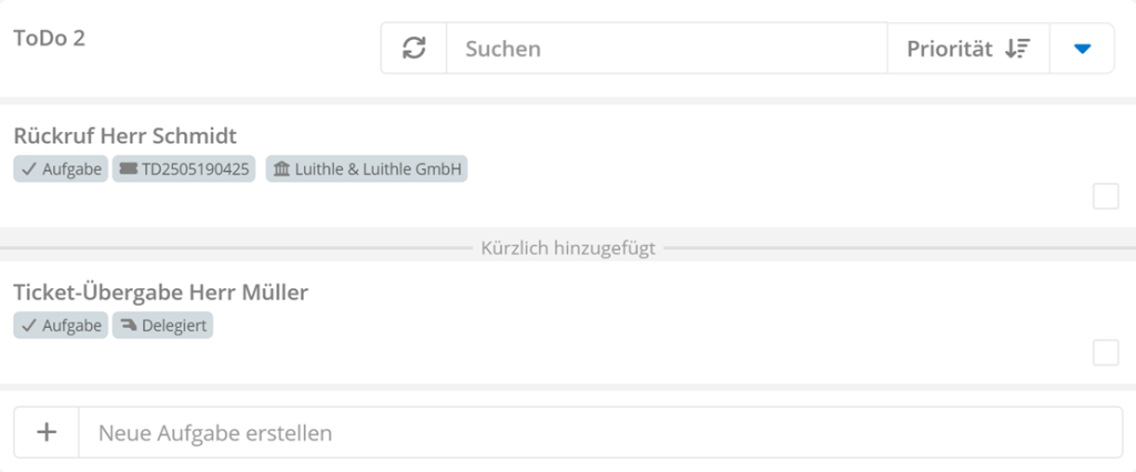 Geben Sie zur Erstellung eines neuen ToDos im Feld Neue Aufgabe erstellen den Titel des ToDos an. Zusätzlich können Sie die Priorität, wann die Aufgabe fällig ist und weitere Details angeben. Daraufhin können Sie dieses