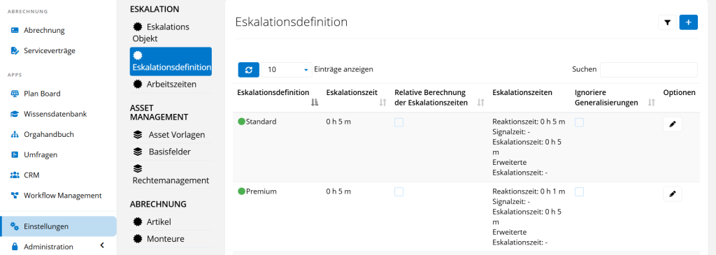 Navigieren Sie unter Einstellungen auf „Eskalationsdefinition“, um zur Übersicht der Eskalationsdefinitionen zu gelangen.