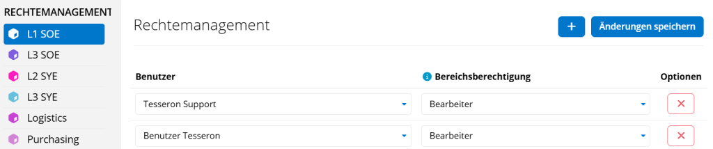 Im Rechtemanagement des Navigationspunkts Einstellungen können Sie die Benutzerrechte der Tesseron Bereiche verwalten.