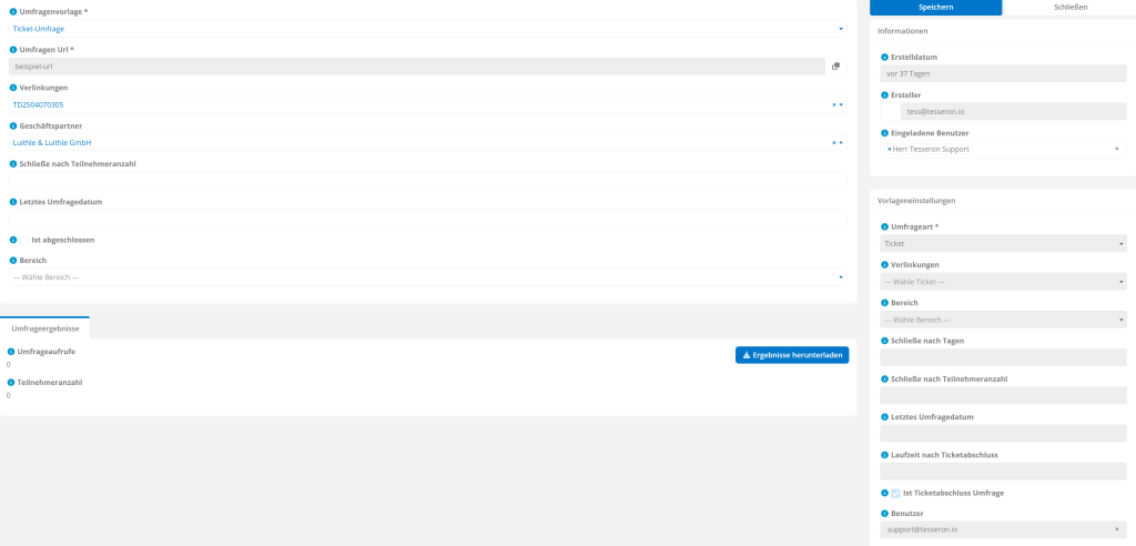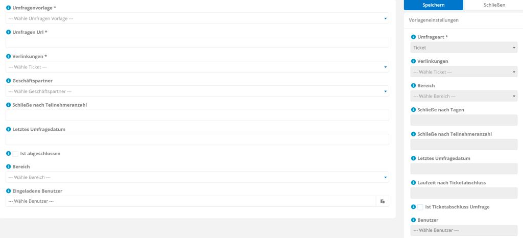 Bevor Sie eine Umfrage erstellen können, benötigen Sie zuerst eine Umfragenvorlage. Unter dem Artikel Umfragenvorlage erstellen wird beschrieben, wie die Konfiguration abläuft.