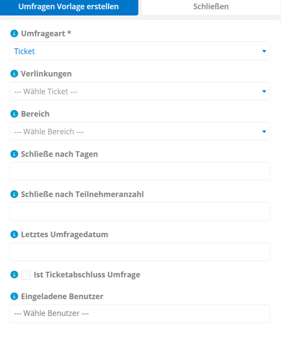Um die Umfrage automatisch per E-Mail zu versenden, wenn ein Ticket abgeschlossen wurden, Haken Sie Ist Ticketabschluss Umfrage an. Daraufhin kommen weitere Optionen hinzu:
