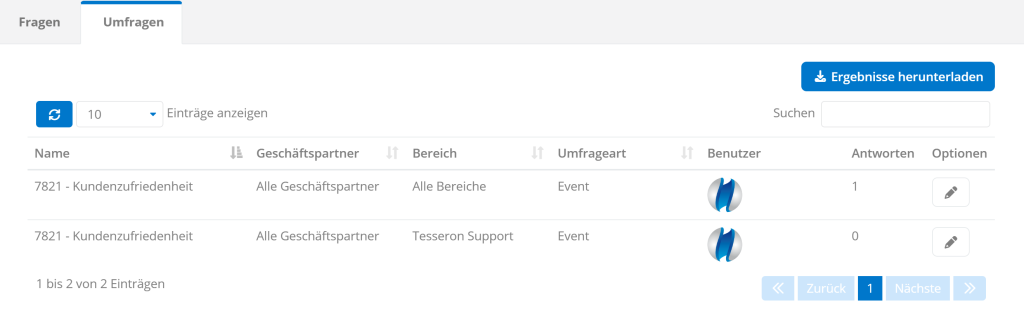 Alternativ kann über die spezifische Umfrage geöffnet werden. Dort können Sie mit einem Klick auf die Ergebnisse herunterladen. Für mehr Informationen zur Bearbeitung oder Erstellung von Umfragen, lesen Sie den Artikel Umfragen erstellen und bearbeiten.